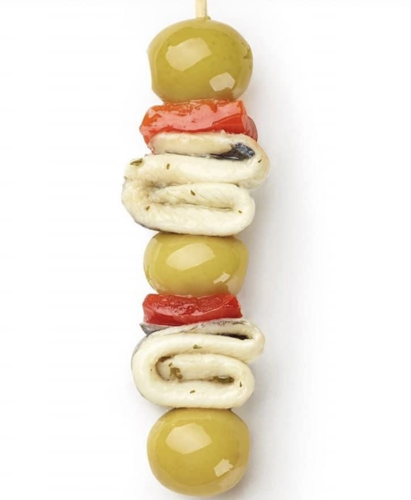 Banderilla compuesta de aceituna rellena de anchoa, boqueron en vinagre, pimiento rojo, ajo y perejil.
